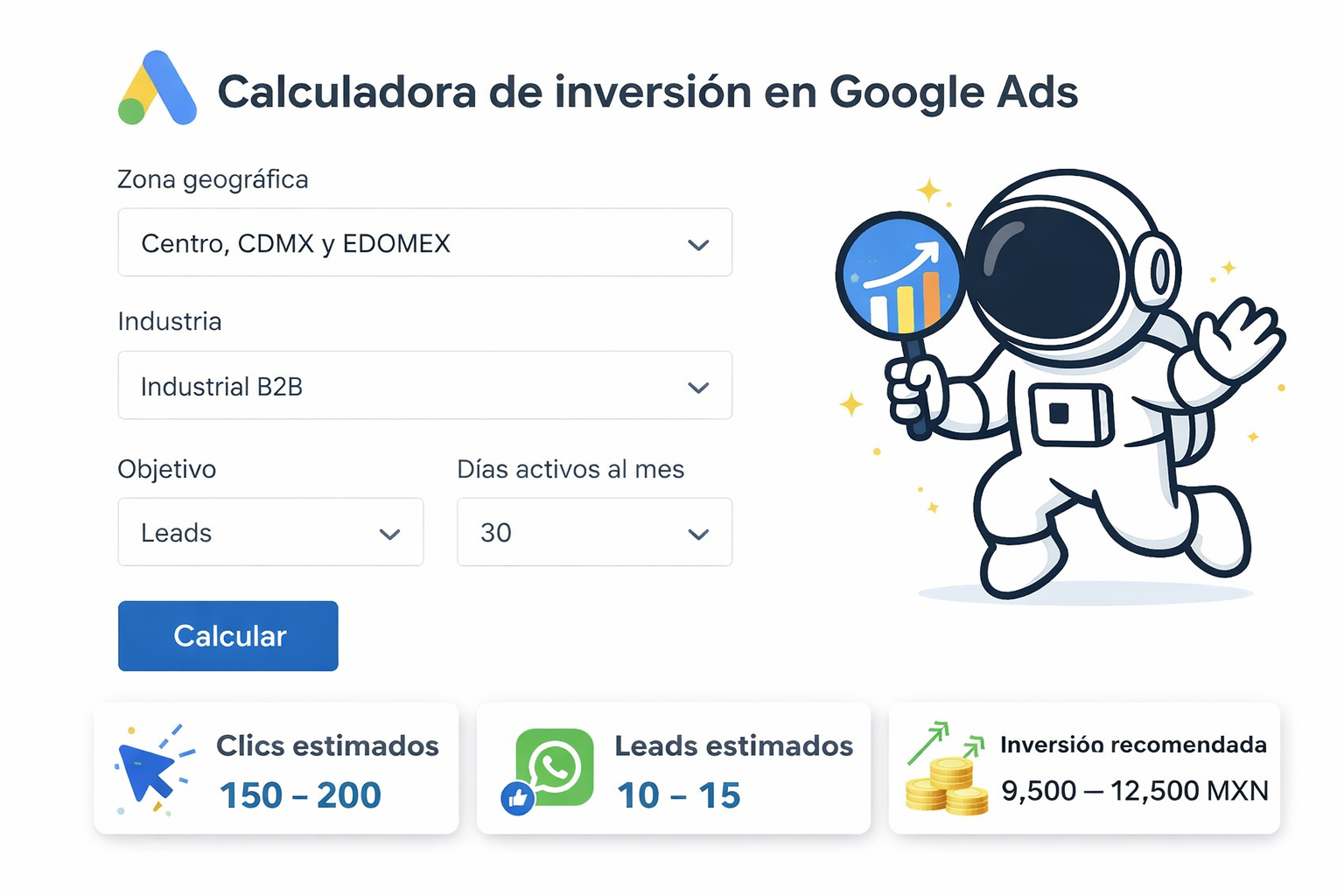 Calcula cuánto invertir en Google Ads según tu industria y zona, o recibe asesoría personalizada sin compromiso; crecer no es suerte, es estrategia. 🚀